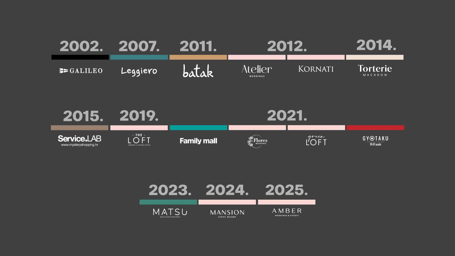 Svoj put smo započeli s modnom industrijom davne 2002. godine s našim prvim brandom Galileo. Pet godina kasnije uplovili smo u ugostiteljske vode s Leggiero barovima. 🍽 Ugostiteljski put nastavili smo s Batak i Matsu restoranima, Torterie Macaron slasticama, Gyotaku sushijem. Sa sedam svadbenih dvorana od 2012. uljepšavamo najvažniji dan u životu svih mladenaca, a 2021. otvorili smo mjesto za najbolji obiteljski shopping - Family Mall. 🛍 Kako bi svi naši brandovi održali željenu razinu kvalitete, osnovali smo i agenciju za ispitivanje kvalitete usluge, Service Lab, koja nam pomaže u poboljšanju i unapređenju naših brandova unutar Grupacije.